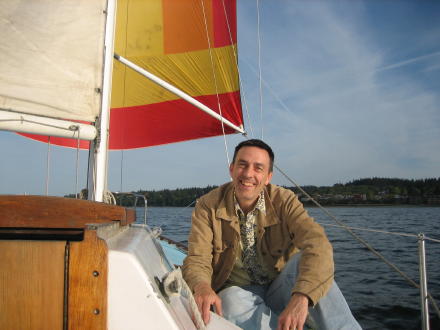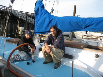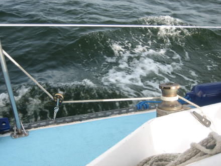 | Big B gets up the spinnaker ... | Katelyn gets to empty the sewage ... it's nice to have the port-a-potty working. |
