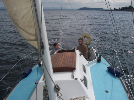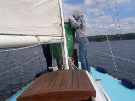 | We are sailing pretty well .... and got it up to 7.9 MPH. | ... here we are taking down the jib. |