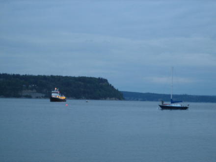 | We get home late and Doug motors the boat out to the buoy ... | ... a tug boat was coming in as Doug gets the Fibonacci all situated. |