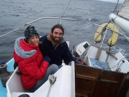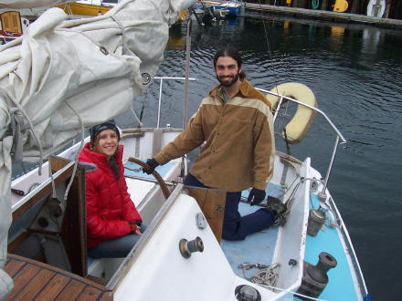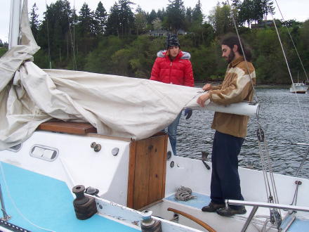 | Now there are two happy sailors! | We are back and getting the mainsail all folded up. |