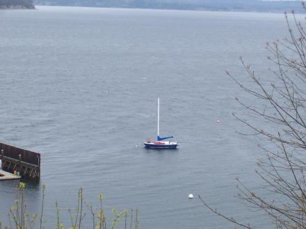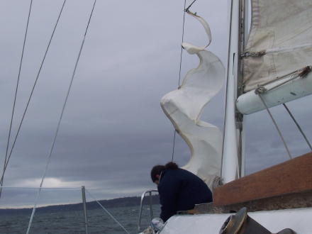| Doug is ready to steer us out of the marina ... | ... getting up the storm jib. |