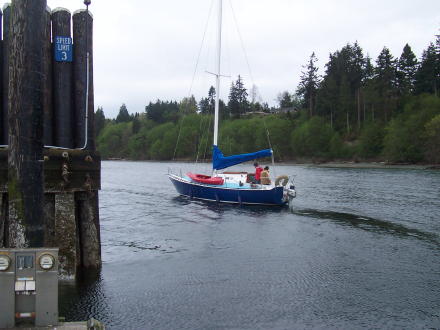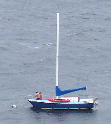 | The boat is going on the buoy ... | ... here are Doug and Michelle tieing it up (see close up below). |