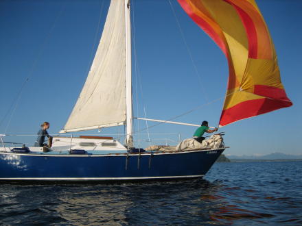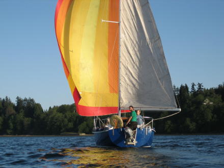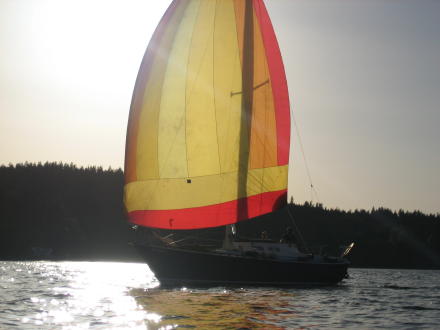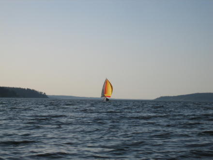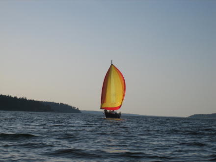 | I catch up to them just as Doug switches the spinnaker pole getting ready to tack ... Michele is doing quite the job as "skipper"! | ... now they are heading on down towards the marina |