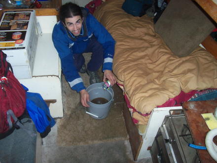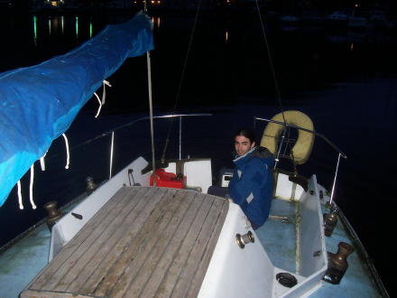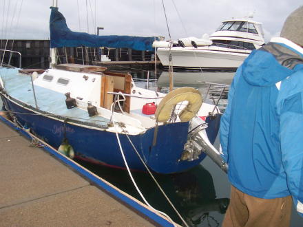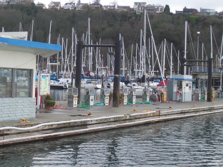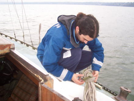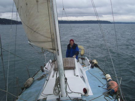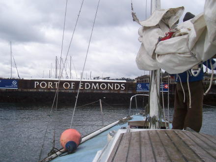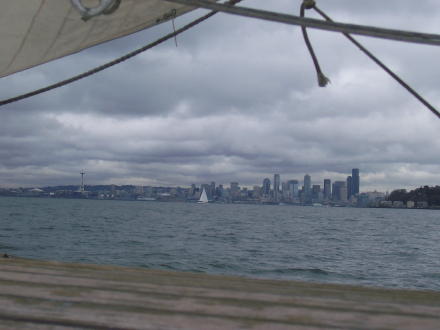 Here we are taking off early in the morning from Tacoma. Doug's working on the lines and bailing some excess water from the cabin. Bruce sailing past Seattle (notice the Space Needle). We got some gas at Shilshole marina and then we stayed the night in Edmonds. We sailed for 8 hours that day. |