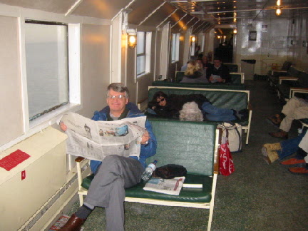 Heading over on the ferry ... Wilf enjoying the paper.