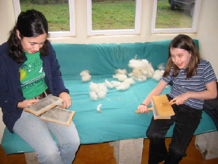 Nora and Annie working on the wool.
