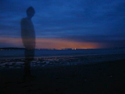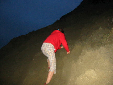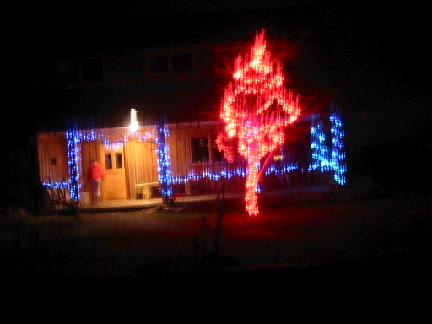 | Doug's trick photography of his shadow and the lights from Seattle. | We finally make it back up to our Christmas lights (that's Eliza at the front door). |