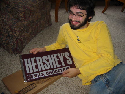 | Opening some presents. | Doug finally gets a chocolate bar he can't eat in one sitting! |